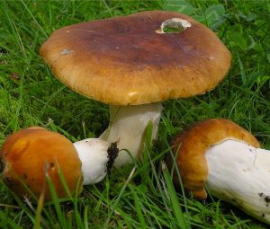 Compatto, carnoso, sodo, nasce spesso interrato ed ha colori simili a quelli del Boletus edulis: un bel marrone fulvo uniforme e opaco,mai troppo scuro.Parliamo della Russola mustelina, cruccio del “porcinaro” incallito che sussulta quando la prova …..ma poi rimane deluso. In realtà, anche se non è proprio un porcino, è pur sempre un ottimo fungo, da usare da solo ma che trova la “sua morte” nel misto,cui dona una particolare e piacevolissima consistenza.